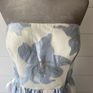 Effortlessly elevate your style with the Cassie Midi Dress, featuring a striking floral organza jacquard design with metal accents. The strapless design and shirred and tiered A-line skirt create a flattering silhouette that is perfect for any occasion.