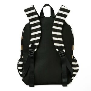 Chic backpack with bold black and gold polka dots. Features stylish stripes and metallic accents. Ideal for a trendy look.