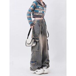 Gothic Denim Pants Women's Loose Wide Leg Stitching Casual High Rise