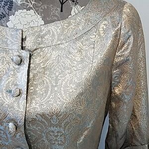 Gorgeous buttom front gold metallic fully lined jacket! The bell sleeves with bow accents are stunning! This would make any black dress a statement piece...