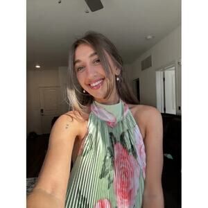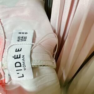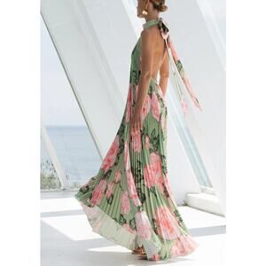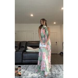 The Olympia Gown by L’IDEE is an elevated, statement-making piece designed for formal and black-tie occasions. This full-length silhouette features a high, full-coverage neckline, signature tie-back halter, and a dramatic deep backless design, finished with a striking asymmetrical hemline. Crafted from high-grade pleated polyester for elegant movement. Size Small. Excellent condition with no visible signs of flaws.
