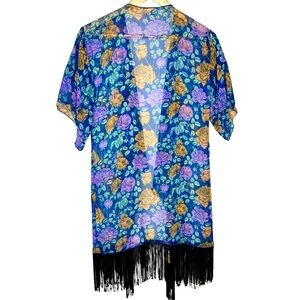 Chic blue kimono featuring a vibrant floral rose pattern and black fringe hem. Ideal for layering. Really beautiful!