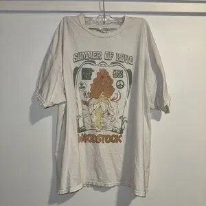 Embrace retro vibes with this Woodstock graphic t-shirt. Featuring a classic cream color, it's perfect for casual outings. Celebrate the spirit of the Summer of Love in style.
