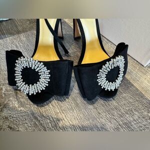These sophisticated black heels feature a striking brooch embellishment on the front, adding a touch of glamour to any formal occasion. The delicate ankle strap and open toe design enhance their elegant appeal, while the warm gold-toned inner lining provides a luxurious contrast.