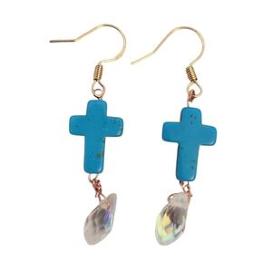 Elevate your everyday ritual with these handcrafted dangle earrings, featuring 18k gold plated hooks for a touch of luxe. Smooth turquoise cross beads offer grounding energy and spiritual symbolism, while faceted crystal teardrops shimmer with light-catching grace.