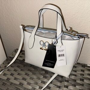 NWT Elegant Nine West crossbody bag in white with white and blue interior. Features sleek design and adjustable strap. Perfect for any occasion.