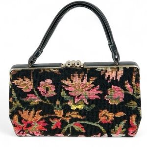 Vintage Needlepoint Purse Bag Unique Dova Tapestry/Carpet Handbag Black Floral