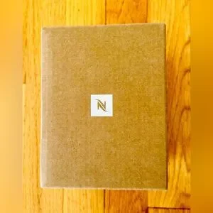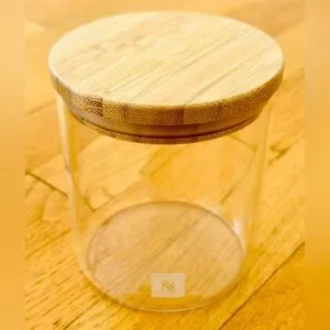 Nespresso Mini Capsule Dispenser. The dispenser is made of glass and has a Nespresso motif. The dispenser lid is made of wood. Brand new in box.
