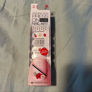 New in box Dashing Diva press-on nail transfers in Garden Party. Package contains 20 nail transfers. Micro thin art seamless transfers onto nails with spot-on precision. Simply size, press, release, and seal with your favorite top coat. Like a waterless tattoo for your nails, the art blends seamlessly with any pre-existing nail polish or gel polish manicure.