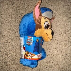 Super soft blue Paw Patrol Chase hooded blanket with hand pockets.