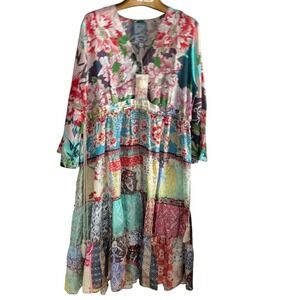 Johnny Was, Dress, Floral, Patchwork, Bohemian, Boho, Tiered, V Neck, Bell Sleeve, Midi Dress, Colorful, Printed, Designer Dress