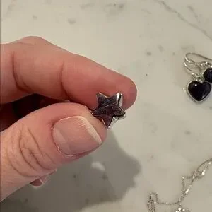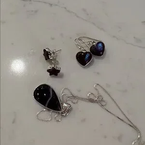 Two pairs of earrings and one necklace. Earrings are labradorite and the necklace is a chevron amethyst. All are sterling silver.