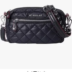 MZ Wallace "Small Crosby" quilted crossbody bag in lightweight matte nylon with leather trim on corners, zipper pulls, pocket edges, and logos. Two main zippered compartments, two outer zippered pockets, two interior slip pockets, one interior zip pocket.