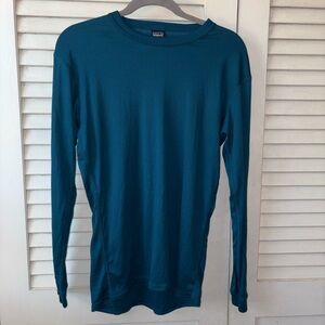 Lightweight performance Patagonia Capilene long sleeve base layer in a deep teal blue. Perfect for hiking, layering, or everyday wear.
