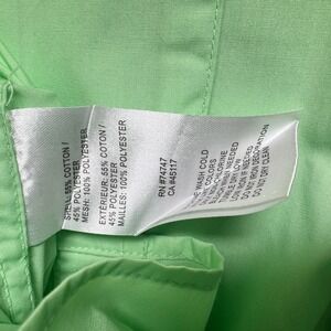 World Wide Sportsman mens short sleeve button up fishing shirt. This vibrant lime green shirt features a collared neckline and a full button front closure. Two chest pockets with button flaps offer convenient storage, and a vented back yoke ensures breathability. Designed for outdoor activities, this shirt is ideal for fishing trips, hiking adventures, or casual everyday wear.