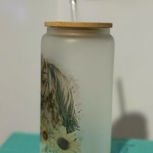 Frosted Glass Tumbler with Horse and sunflower designs glass straw bamboo lid