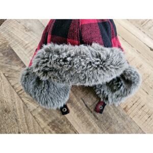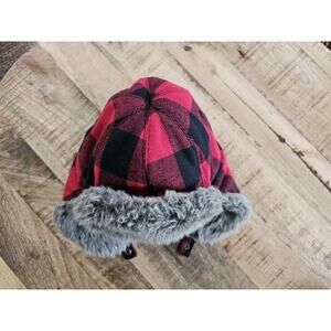 EDDIE BAUER Wool Blend Hadlock Trapper Hat~ Red Checkered / Faux Fur~Size S/M