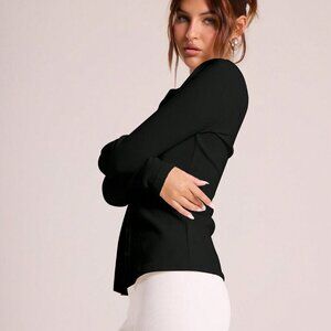 Black Casual Women's Ribbed Button down Long Sleeve Crew Neck Top