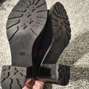 Genuine leather/suede. Black. Lace up withe easy on/off side zipper. Peek-a-Boo open toe. Combat style with feminine details. Top quality! 7.5. Can fit up to 8 IMO.