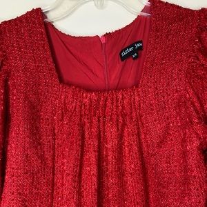Sister Jane heavyweight non-stretch tweed mini dress , elastic square neckline, short puff sleeves with banded cuffs, back zipper closure b, fully lined , seam pockets.