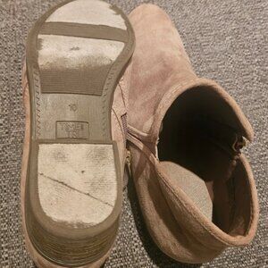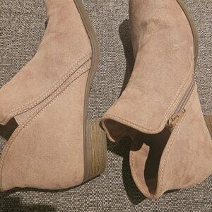 These are cute boots with a faux suede look they are a light tan or beige. These would be cute with jeans or with a cute dress and the low heel make them comfortable.