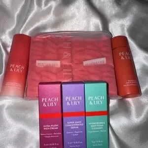 Peach & Lily skincare set includes serums and a pink headband. Perfect for a complete skincare routine.