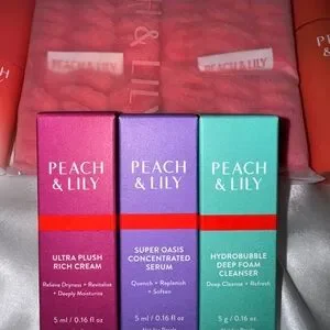 Peach & Lily 6 Piece Skincare Set Cream Serum Cleanser Face Polisher Wristbands