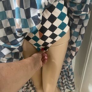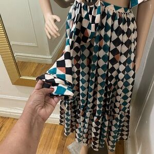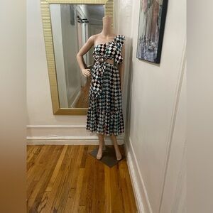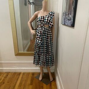 Chic one-shoulder dress with vibrant geometric design. Features a stylish cutout detail. Ideal for making a statement.