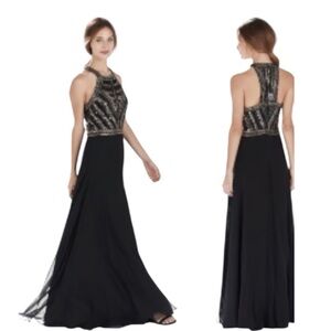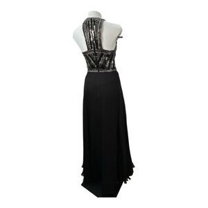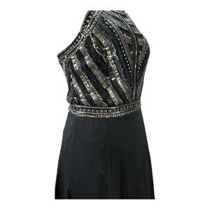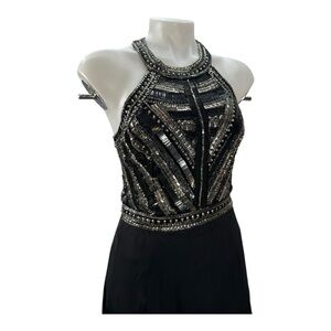 This stunning black dress features intricate beading and a chic halter neckline, perfect for any special occasion.