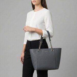 Elevate your style with this Calvin Klein tote bag, combining sleek design and practicality. Its durable leather, spacious interior, and elegant chain straps make it both functional and chic.