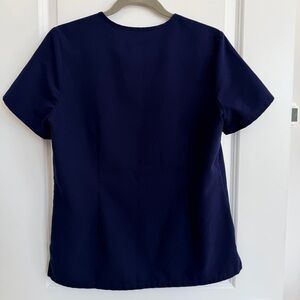 Figs scrub top in navy blue. V-neck design with chest pocket and short sleeves.