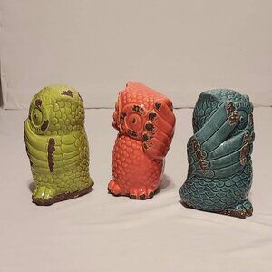 Group of Three Destressed Little Owl's Orange Blue & Green 61/2" Tall