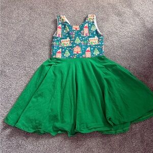 Vibrant green dress with a colorful festive pattern on the top. Perfect for holiday celebrations. Handmade major twirl. Easy to layer. Gingerbread village theme.