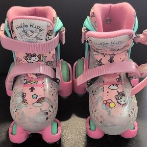 Gently Used Charming Hello Kitty roller skates in pink and mint. Features playful design with Hello Kitty graphics. Ideal for kids who love adventure.