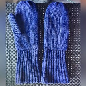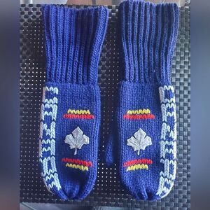 These mittens were knitted by my best friend's mom and have been with me since 1979. I also have them in red, which I am keeping, so thought I'd share the patriot love in blue. Thick acrylic wool, stockinette stitch with maple leaf appliqué. So warm, cut and cozy. In excellent pre/still loved condition. <3