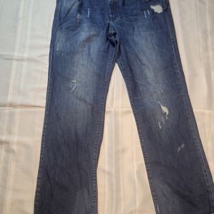 Dark blue straight jeans with a distressed finish. Classic style with a modern edge.