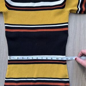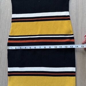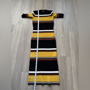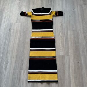 Chic midi dress with bold stripes. Features black, yellow, and pink tones. Ideal for versatile styling.