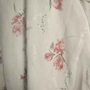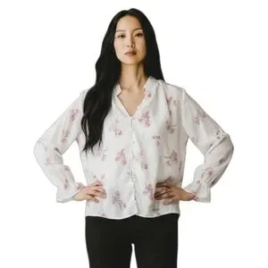 This elegant and delicate button-up blouse features a refined Mandarin collar and a white base with soft pink floral print and delicate white embroidery. Designed with sheer long sleeves and elastic gathered cuffs for a romantic, feminine touch. Finished with charming white button loop closures down the front for a vintage-inspired look. Lightweight and airy, perfect for dressing up denim or pairing with tailored pieces.