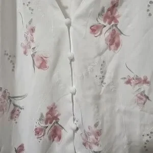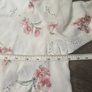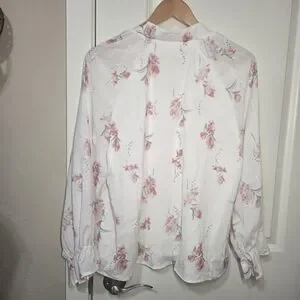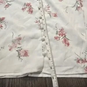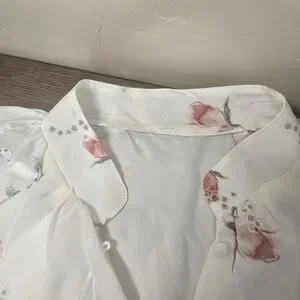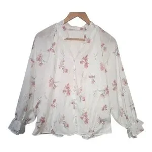White Pink Floral Button-Up Blouse with Mandarin Collar Size Large - Cottagecore