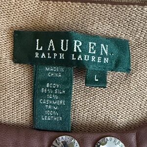 Lauren Ralph Lauren tan light brown cardigan with brown leather accents, silver buttons and zipper closure.