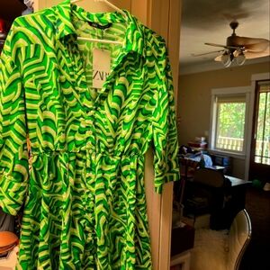 Eye-catching lime green and white abstract dress by Zara. Ideal for a standout style.