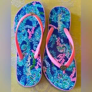 Excellent preowned condition. Worn once on cruise. Lilly flip flops in Corsica Blue TurtleVilla. Size 7/8. Smoke free home.