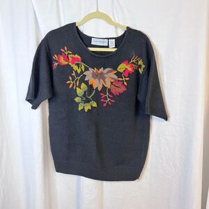 Norton McNaughton vintage short sleeve black sweater leaf embroidery Size Medium