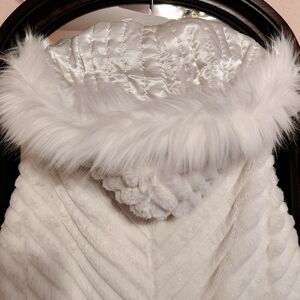 Elegant faux fur hooded vest. Features a full zip front. Soft and stylish design.