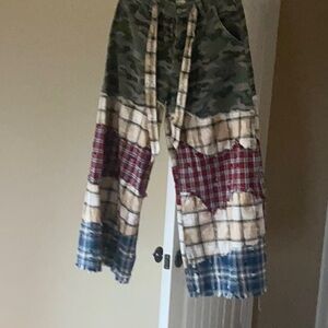 Bold wide leg pants with a mix of camouflage and plaid patterns. Features green, tan, and red patches. Eye-catching and stylish design. New without tags never worn.