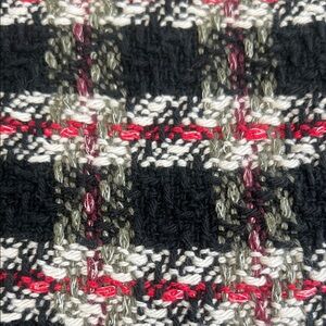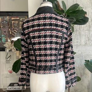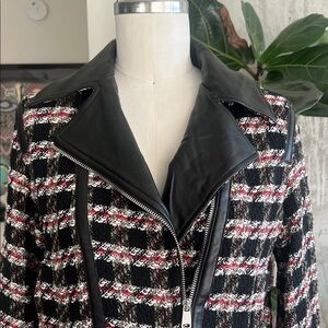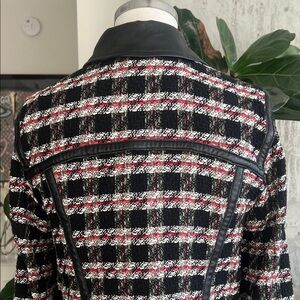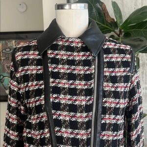 Stylish tweed blazer with faux leather accents. Features a classic check pattern. Ideal for versatile wear.