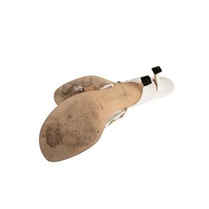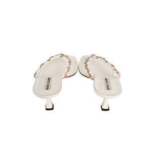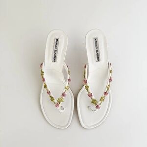Manolo Blahnik White & Pink Floral Appliqué Leather Thong Sandal Heels