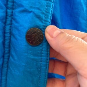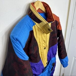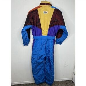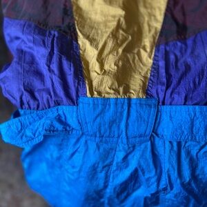 Perfect unisex set. Colors: aqua blue, purple, orange yellow, burgundy, and black. Magnificent patchwork! 😉 It has a hat tucked into the collar, epaulettes with undefined shoulders, an elastic waistband hidden by its belt, and zippered pockets on each side. Shoulder to shoulder: 20 inches. Armpit to armpit: 21 inches. Waist: 14 inches. Inseam: 13 inches. Length: 56 inches.no stretch