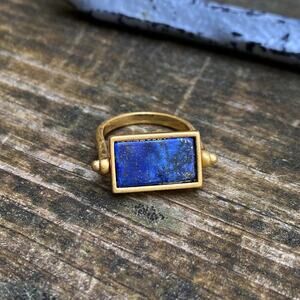 Features: gold plated brushed stainless steel, lapis stone, ring flips from stone to flat surface
