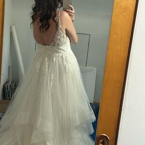 This dress looks STUNNING and looks absolutely brand new. No stains, no holes or rips or tears. It has been in a hanging dress zippered bag. There are pictures of me in the dress. It has layers of shiny and sparkly tulle with beading. It has cups already in the bust of the dress.